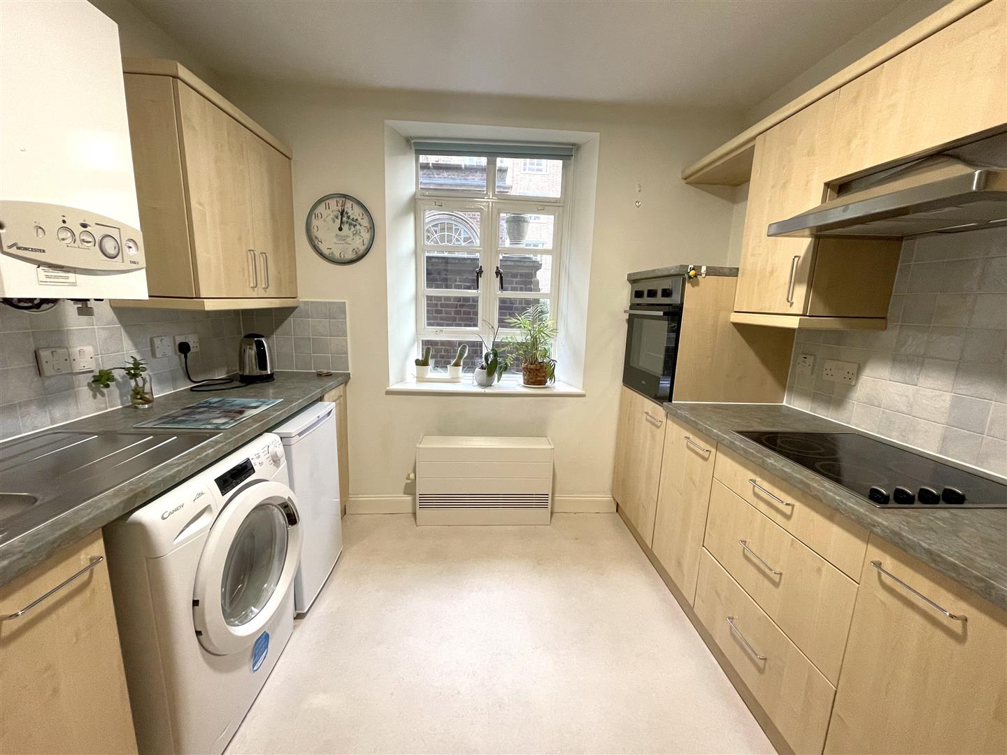 Fitted kitchen with wall and floor mounted units, windows to the side and gardens, four ring hob with extractor fan over, roll top work surface with inset stainless steel sink and drainer, mixer tap, eye level oven, integrated fridge and additional appliances including washing machine and freezer. Wall mounted Worcester central heating gas boiler.